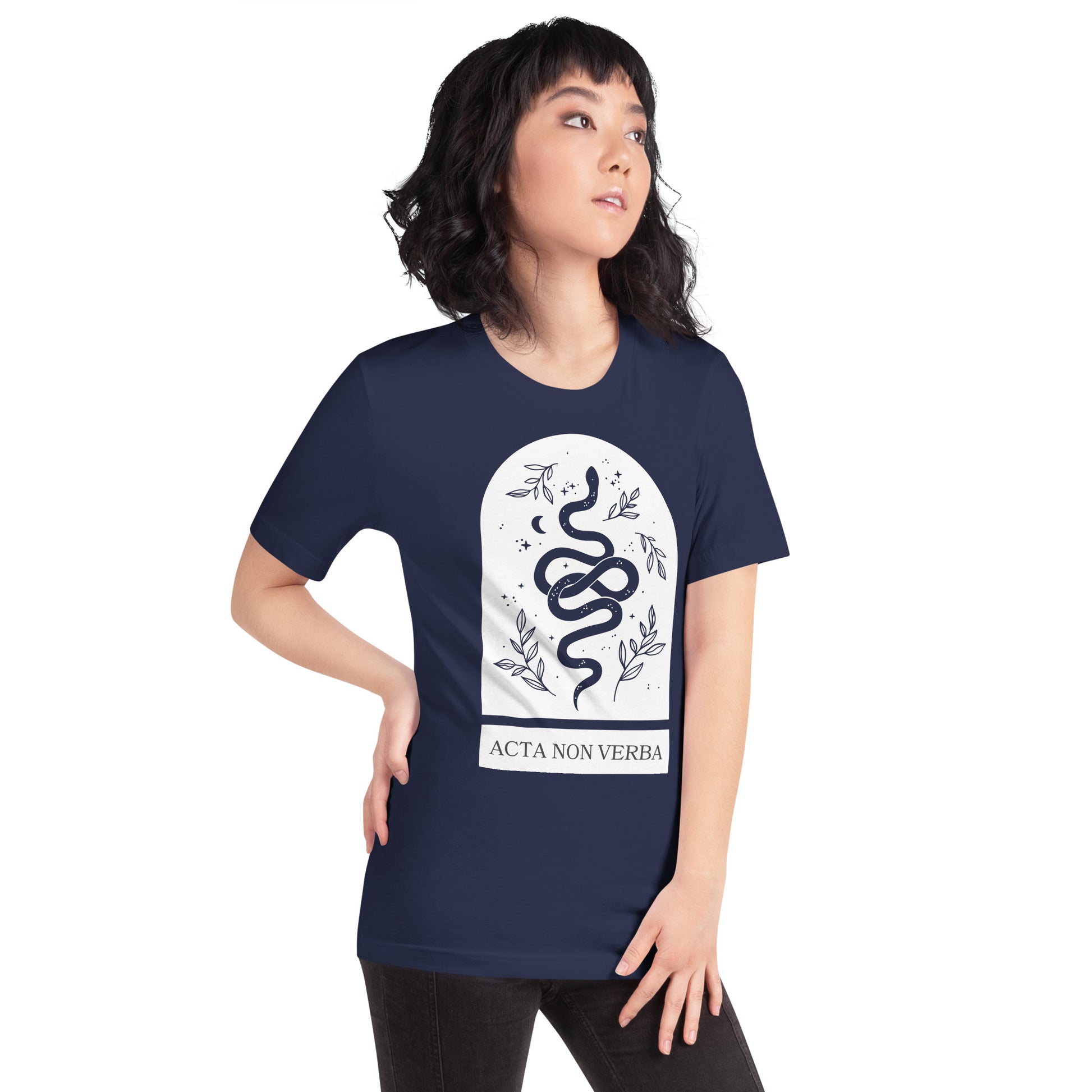 Acta non verba is Latin for "action, not words" otherwise explained as actions speak louder than words. This design was inspired by Prince Wrath of Hell from the Kingdom of the Wicked series. Featuring a snake with greenery, stars, and a moon, all inside a window-shaped frame with the Latin words below it.