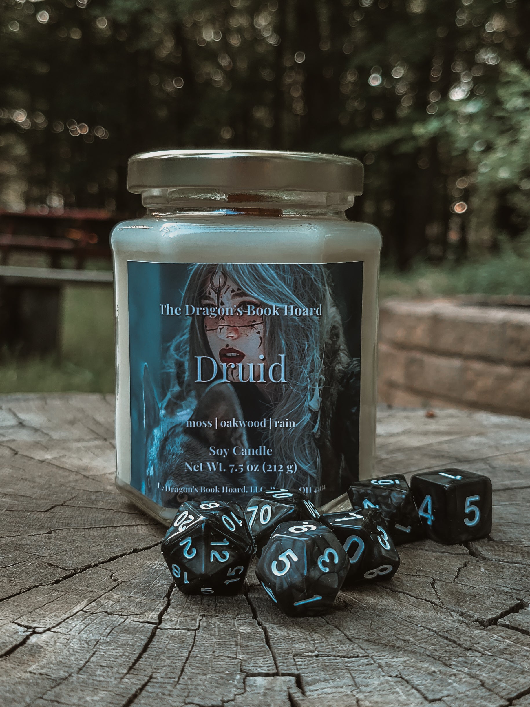 With high wisdom and proficiency in animal handling, Druid is here to reconnect you with nature with this earthy scent and flickering tiny bonfire like wick. May this scent aid you in your next campaign session.
