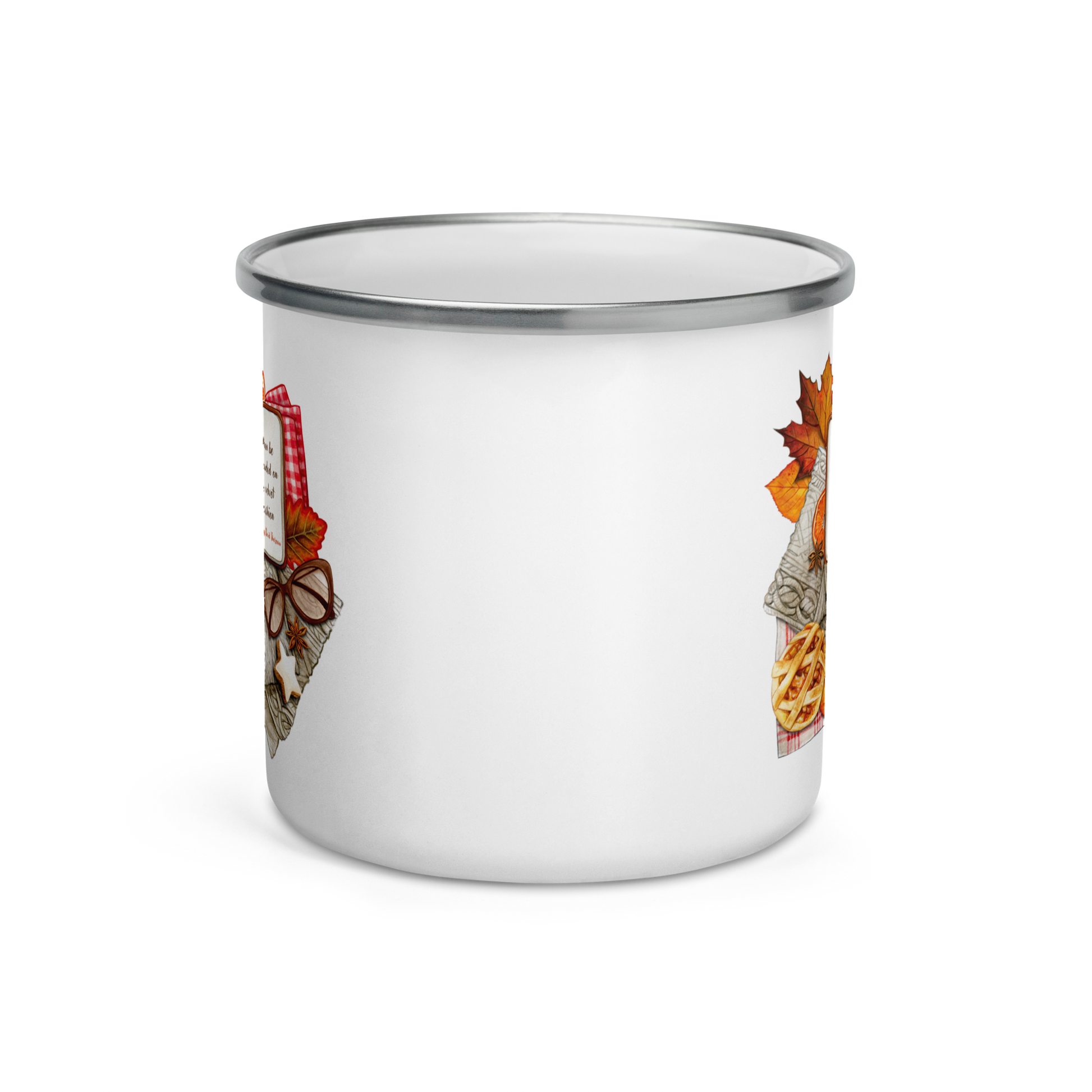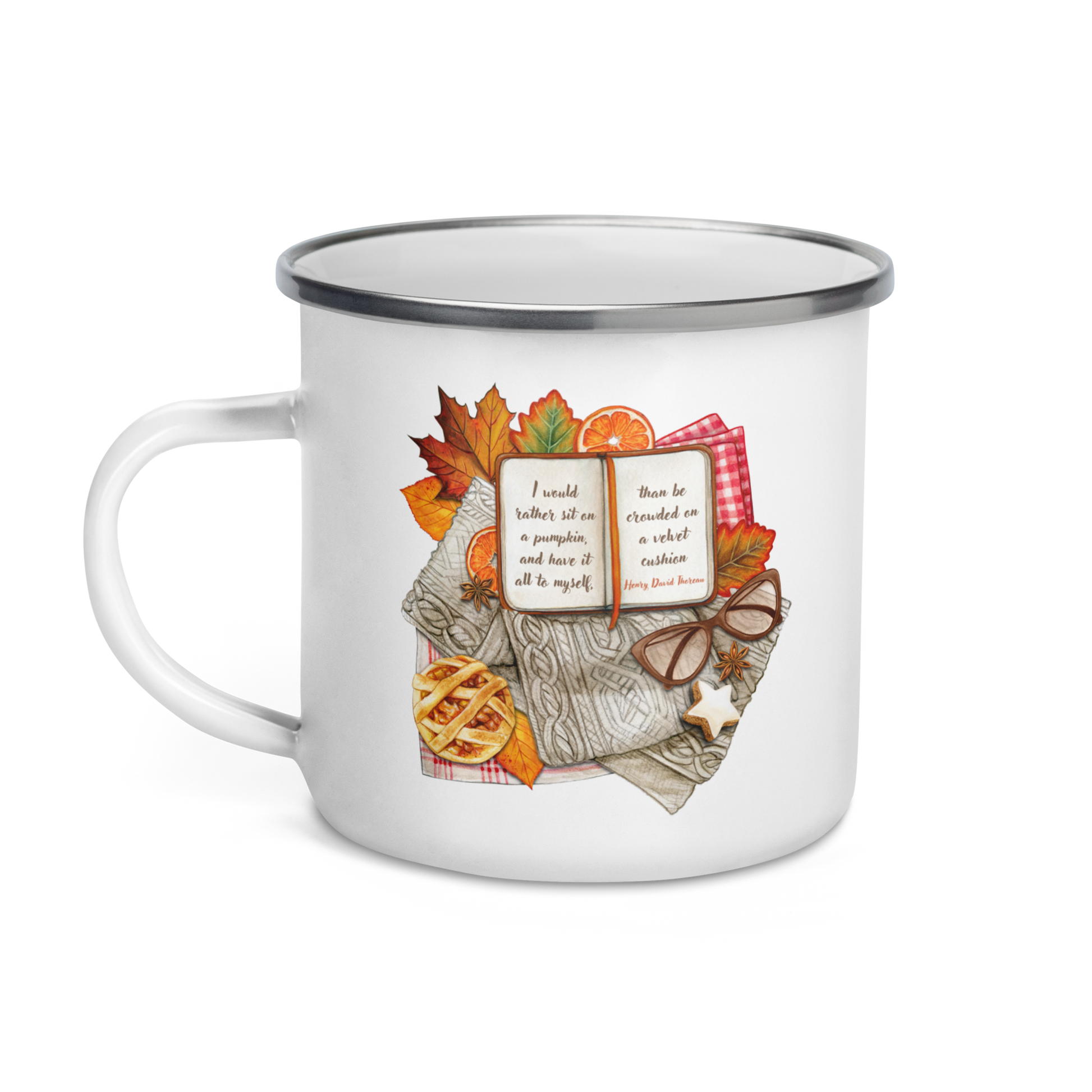 Enjoy your fall camping adventures with this fall bookish enamel mug! The quote featured says "I would rather sit on a pumpkin, and have it all to myself, than be crowded on a velvet cushion." - Henry David Thoreau