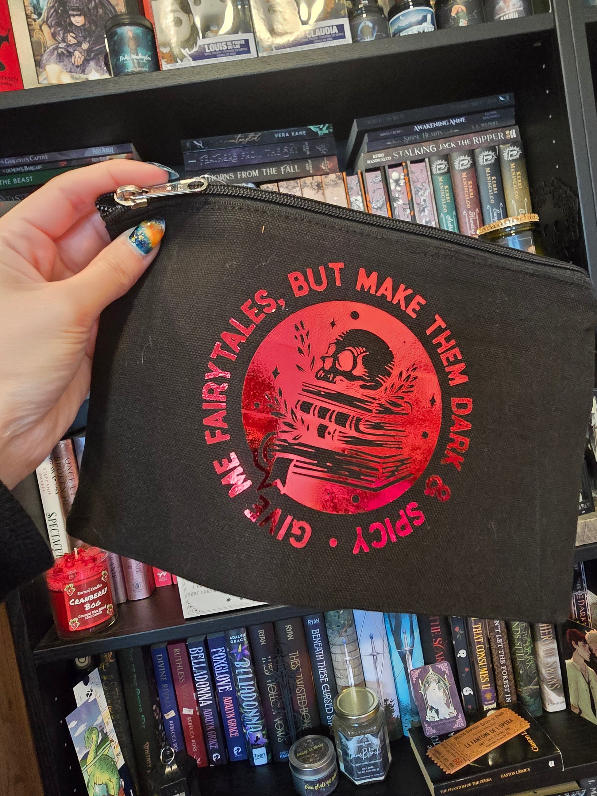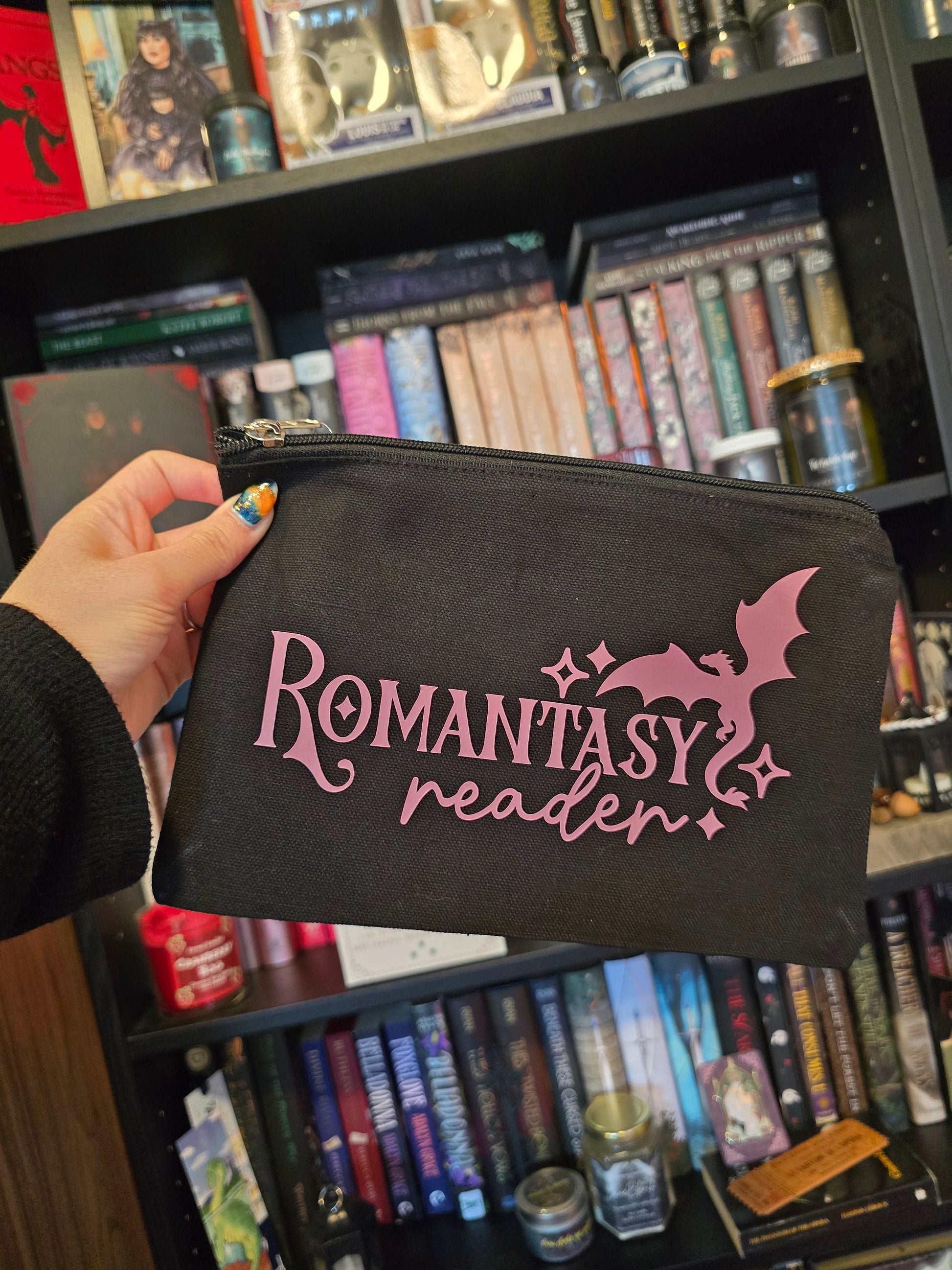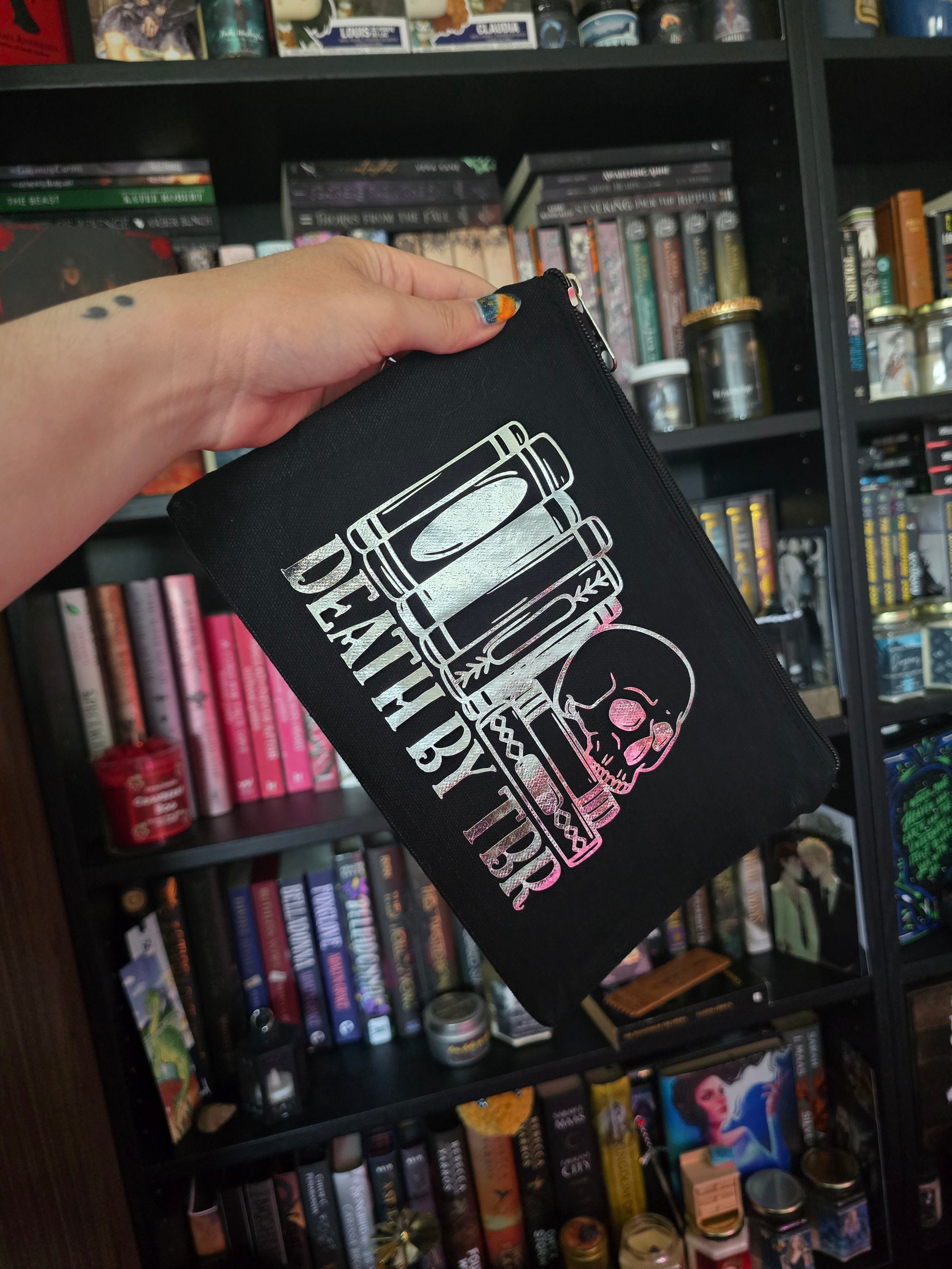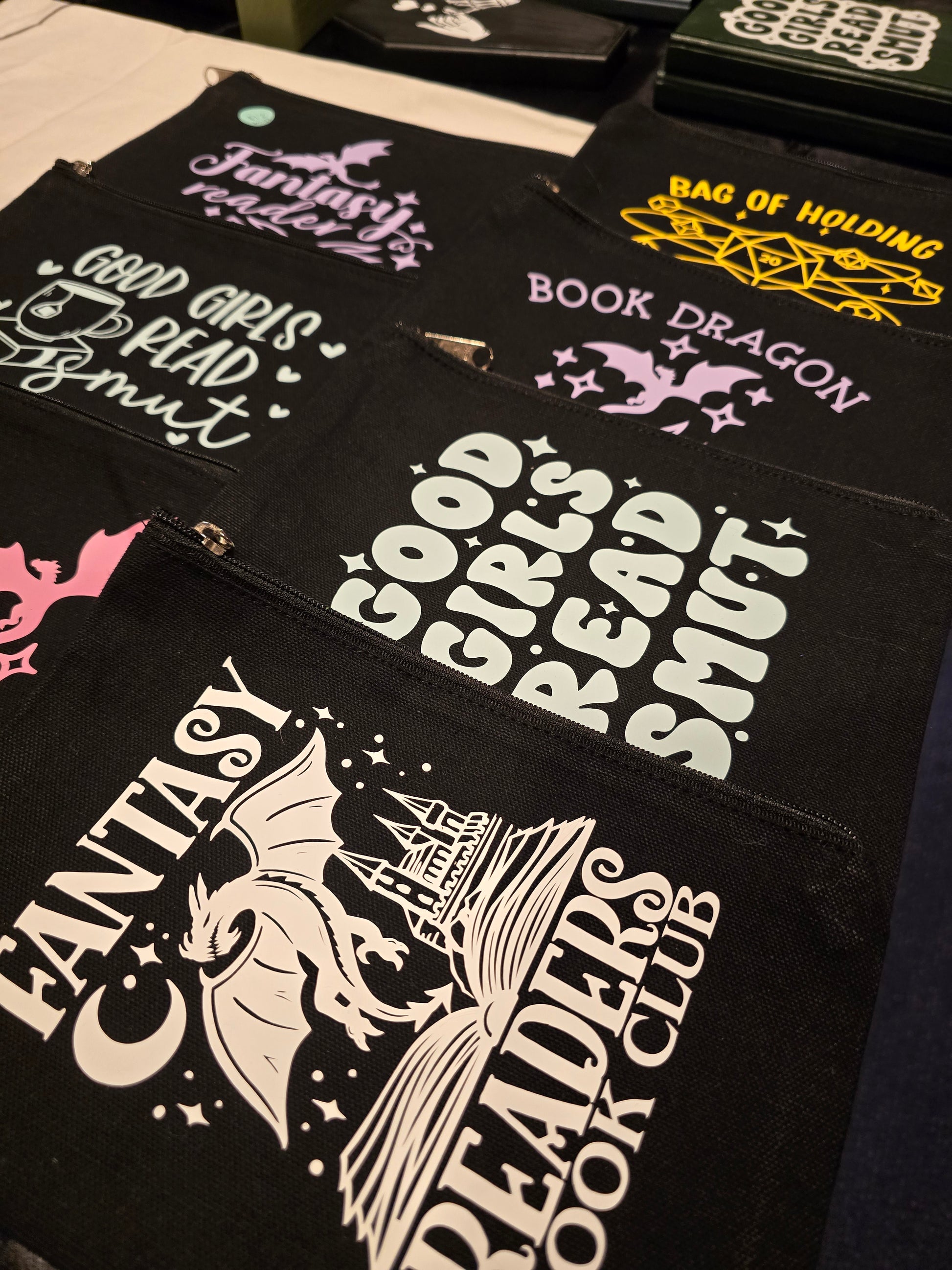 Zipper pouch for all your reading, journaling, or even cosmetic needs! These bags are approximately 6 inches x 9 inches x 2 inches with a silver metal zipper and heat-pressed vinyl designs.